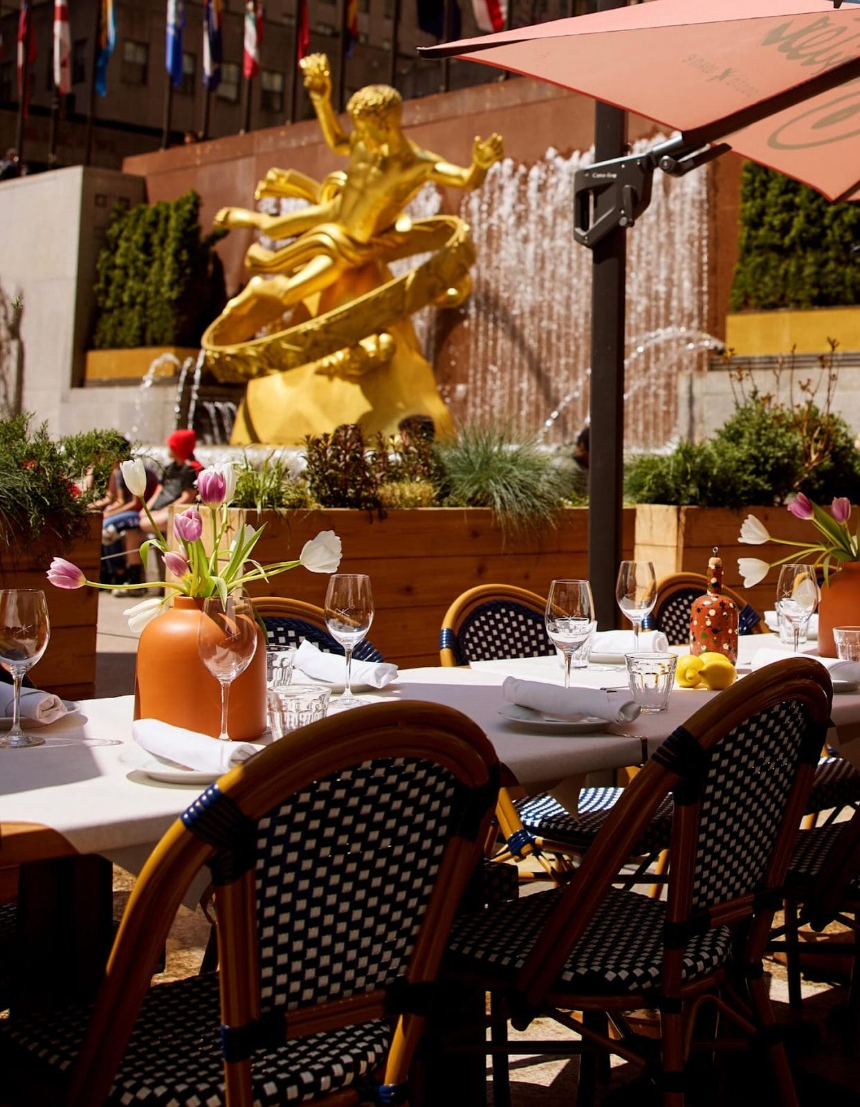 This is a seasonal pop-up right on the plaza. It’s one of the most fun places to eat near Rockefeller Center because you’re literally in the middle of all the action, with a great “view” of the rink and the flags. It’s a wine garden with snacks.